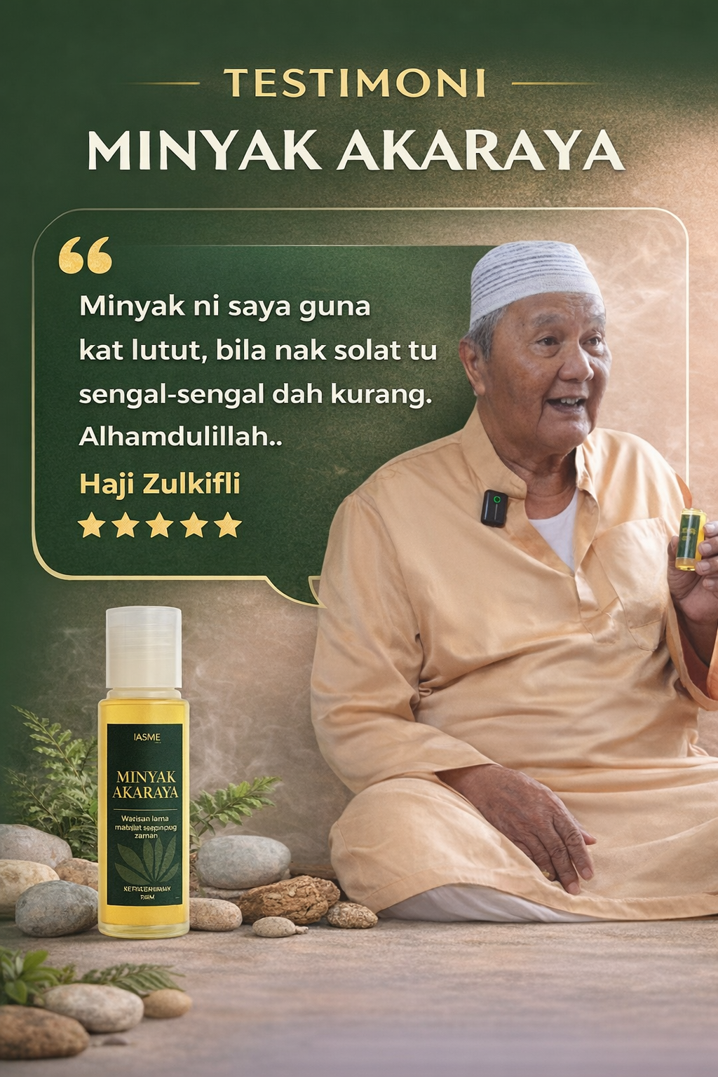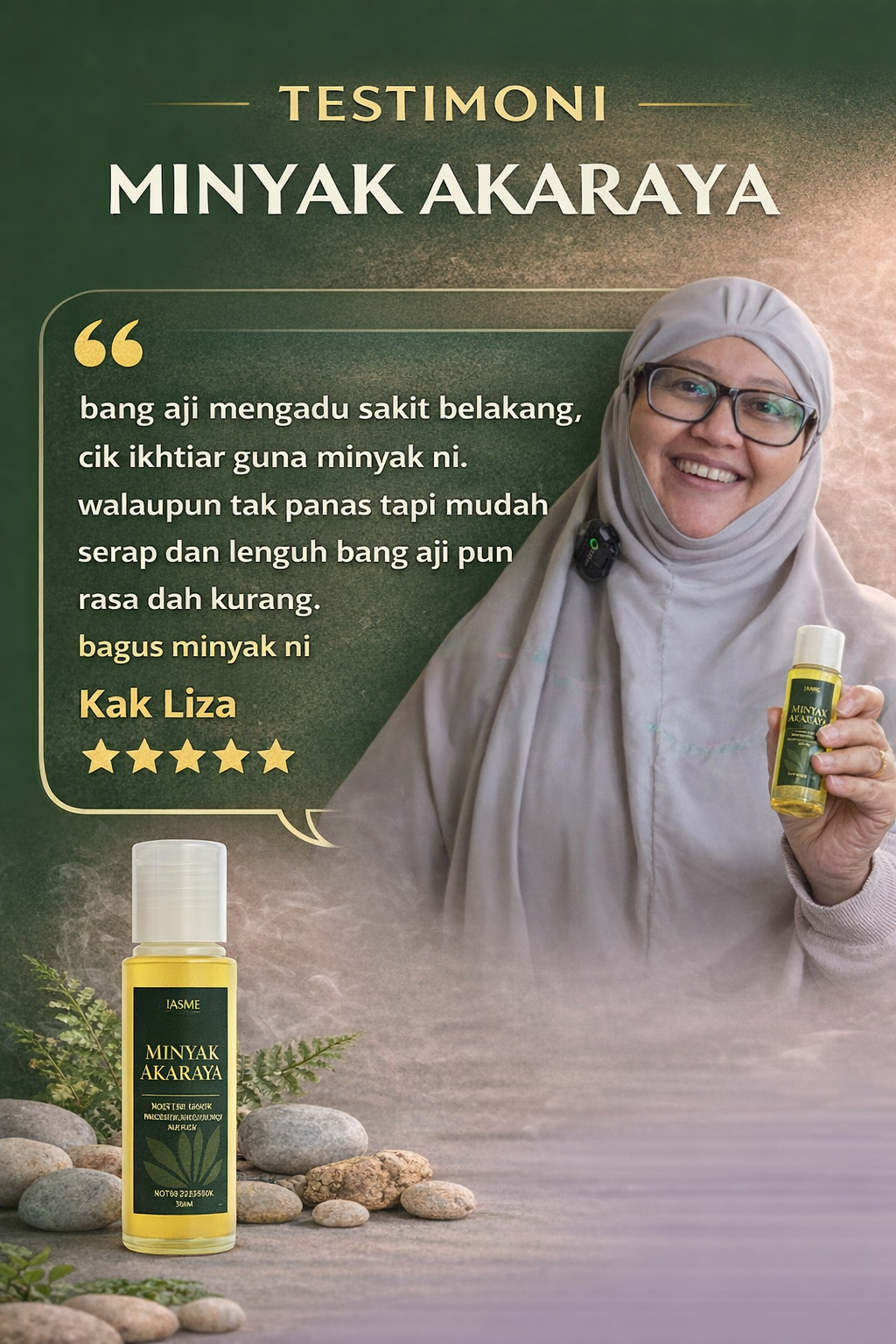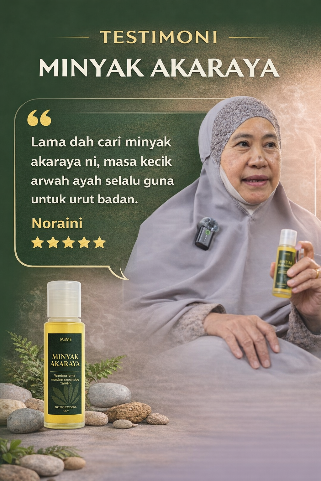 Minyak Akaraya Ini bukan sebaring minyak panas biasa yang anda jumpa di kedai runcit. Ini adalah formulasi Minyak Asas Perahan Pertama (First Infused Batch).